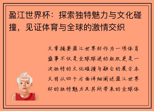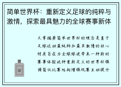 文章摘要:领导世界杯:创新管理模式助力赛事成功背后的战略思考与实践,探索了如何通过管理创新确保一项全球性赛事的高效运营与巨大成功。本文从四个核心领域进行深入分析:第一,战略规划与赛事管理,通过精确的时间表与资源分配来实现赛事目标;第二,数字化创新与智能管理,如何利用现代技术提升赛事体验和保障赛事安全...